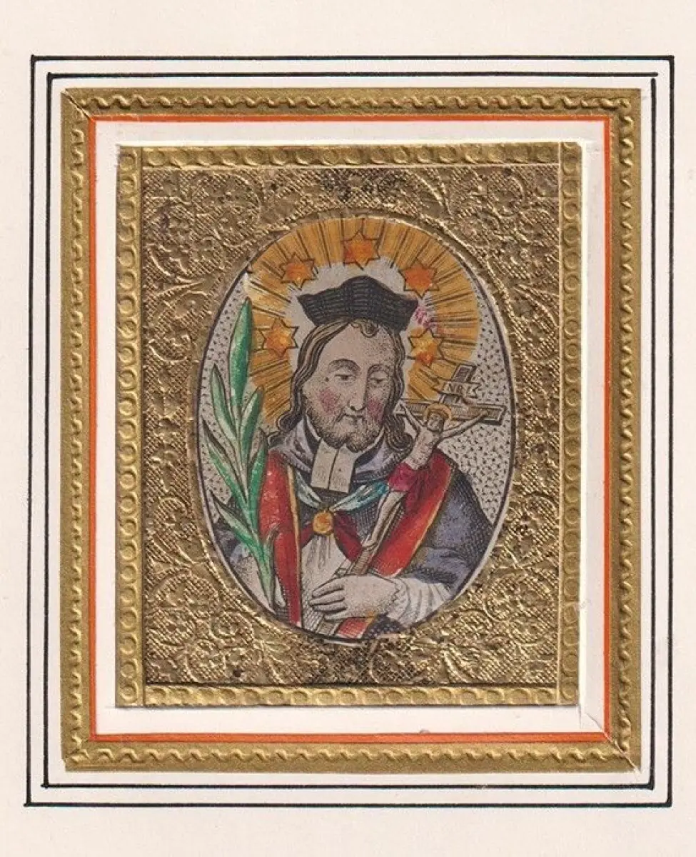 Bemerkungen: Ovaler Kupferstich auf vergold. Stanzbild auf dem Fragment eines kolor. Gebetszettels "Willst Du mit Jesu Rosen brechen, so achte nicht der Dornen stechen".- Der Brückenheilige Johannes von Nepomuk wurde von der Karlsbrücke in die Moldau gestürzt und ertränkt. Er wurde 1729 heiliggesprochen. Sein Festtag ist der 16. Mai.