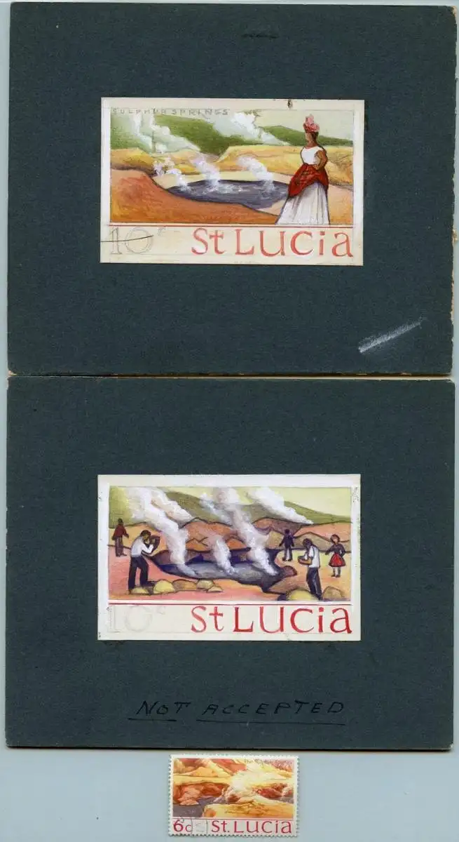 St. Lucia 1970 Original-Entwürfe Freimarke Schwefelquellen auf Karton RAR