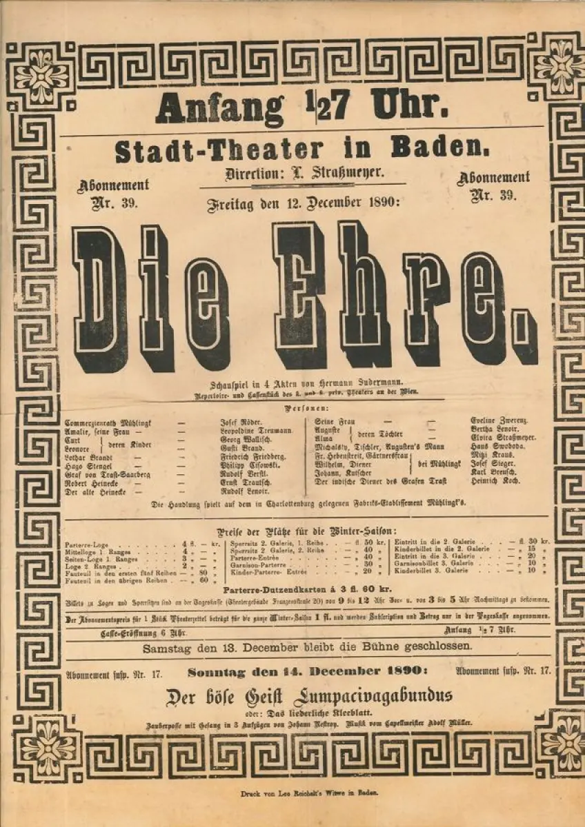 Bemerkungen: Theaterplakat des Stadttheaters in Baden bei Wien. Am Schluss mit Vorschau: Sonntag den 14. December 1890: Der böse Geist Lumpacivagabundus [ ]. Zauberposse mit Gesang in 3 Aufzügen von Johann Nestroy.