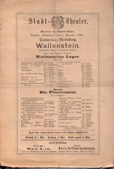 StadtTheater (Breslau). - Direction: Theodor Loewe. - Schiller, Friedrich von: Programmzettel zu: Wallenstein (Wallensteins Lager, Die Piccolomini). Dramatisches Gedicht. Regie: Herr Hoffmann. Aufführung: 4. Februar 1899. (Aus der Breslauer Theater - Zeit