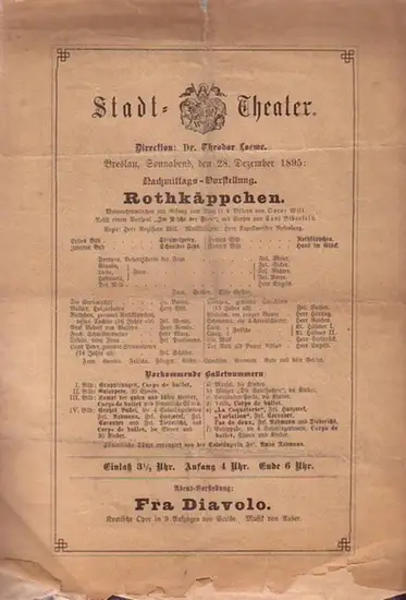 StadtTheater Breslau. - Direction: Theodor Loewe. - Will, Oscar / Biberfeld, Carl: Programmzettel zu: Rothkäppchen (Rotkäppchen). Weihnachtsmärchen mit Gesang und Tanz in 4 Bildern nebst einem Vorspiel mit Versen. Regie: Herr Will. Aufführung: 28. Dezembe