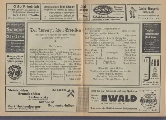 Stadttheater Freiberg / Sachsen. Intendanz: Ernst Lüsenhop. - Hanns Gobsch: Der Thron zwischen Erdteilen. Programmheft des Stadttheaters Freiberg / Sachsen. Insz.: Ernst Lüsenhop, mit u. a.: Edith Röhner, Anny Kynast, Karl Milling, Willi Danek, Kurt Teumn