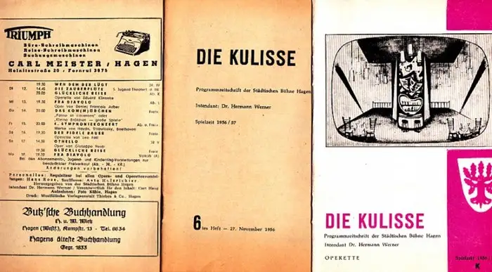 Städtische Bühne Hagen. Hermann Werner-Intendanz (Hrsg.): Die Kulisse. Heft 6 und 12 Spielzeit 1956/57. Programmzeitschrift der Städtischen Bühne Hagen. Konvolut von 3 Heften.