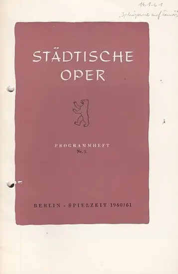 Städtische Oper Berlin. - Intendant Ebert, Carl. - Christoph Willibald Gluck: Programmheft Nr. 5. Spielzeit 1960 / 1961. Mit Besetzungsliste zu: Iphigenie auf Tauris. Musikalische Leitung: Christian Vöchting / Inszenierung: Wolf Völker / Bühnenbild und K