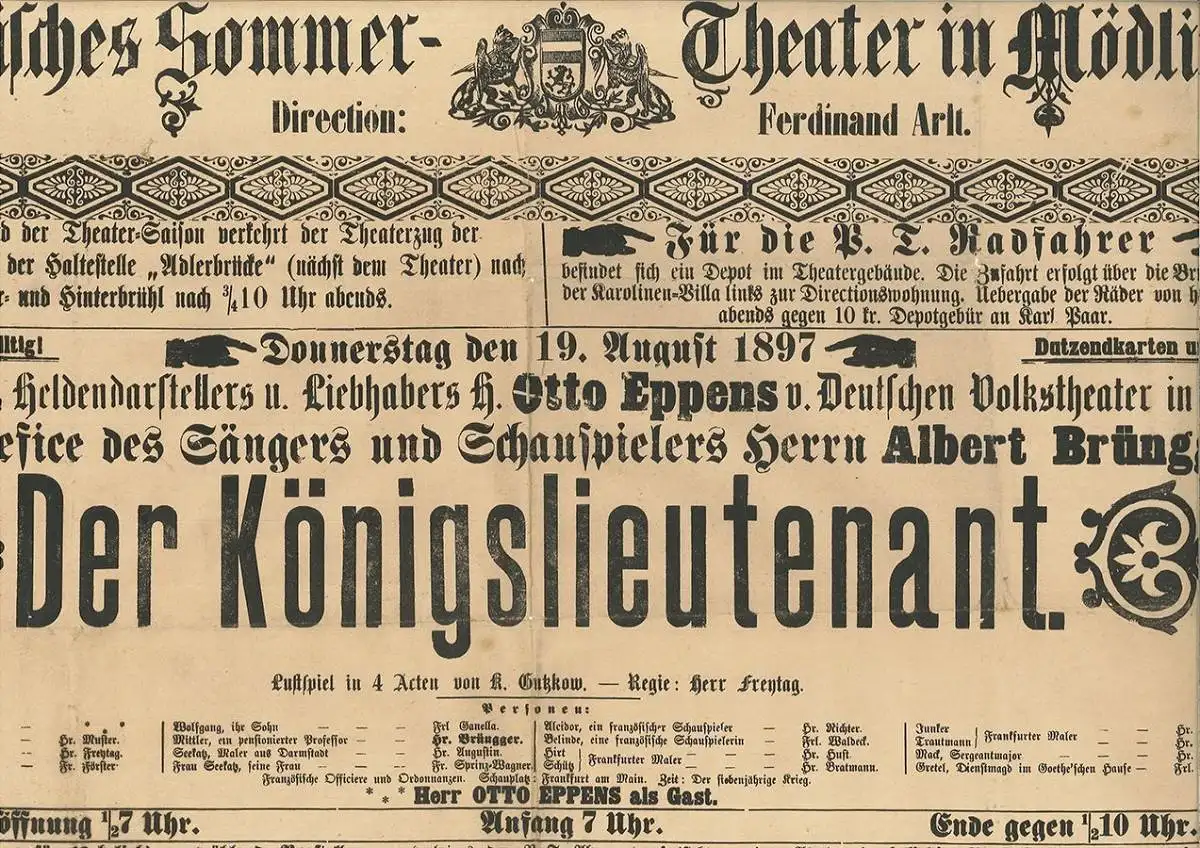 Bemerkungen: Theaterplakat des Sommer-Theaters in Mödling zu einer Vorstellung des Stückes "Der Königslieutenant" von Karl Gutzkow (1811- 1878). "Für die P. T. Radfahrer befindet sich ein Depot im Thaetergebäude [...] Uebergabe der Räder von halb 7 abends gegen 10 kr. Depotgebühr an Karl Paar. [...] Das auf der Bühne in Verwendung stehende Pianino wurde aus dem Clavier-Etablissement der Firma Albin FÖRSTL, Mödling, Hauptstraße Nr. 23, bezogen".