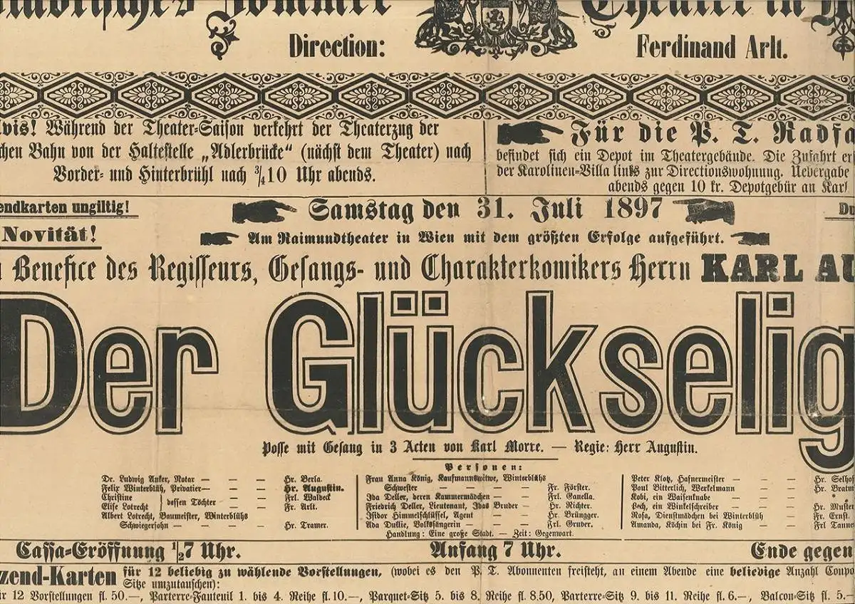 ArtikeldetailsStädtisches Sommer-Theater in Mödling. Direction: Ferdinand Arlt. Samstag den 31. Juli 1897. Am Raimundtheater in Wien mit dem größten Erfolge aufgeführt. Zum Benefice des Regisseurs, Gesangs- und Charakterkomikers Herrn Karl AUGUSTIN. Der Glückselige. Posse mit Gesang in 3 Acten von Karl MORTE - Regie: Herr Augustin. [MÖDLING] -