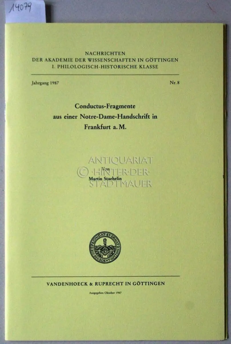 Staehelin, Martin: Conductus-Fragmente aus einer Notre-Dame-Handschrift in Frankfurt a.M. [= Nachrichten der Akademie der Wissenschaften zu Göttingen, Philologisch-Historische Klasse, Jg. 1987, Nr. 8].