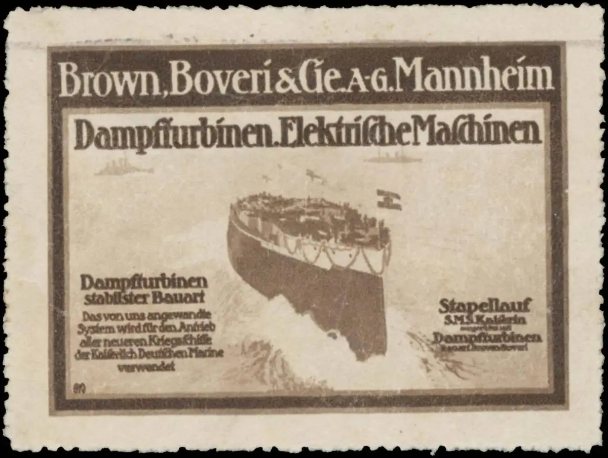 Dampfturbinen, elektrische Maschinen, Schiff, Dampfschiff, Größe/Zustand: 5x7 , leicht fleckig, Original alte Reklamemarke die seinerzeit für die Werbung benutzt wurde