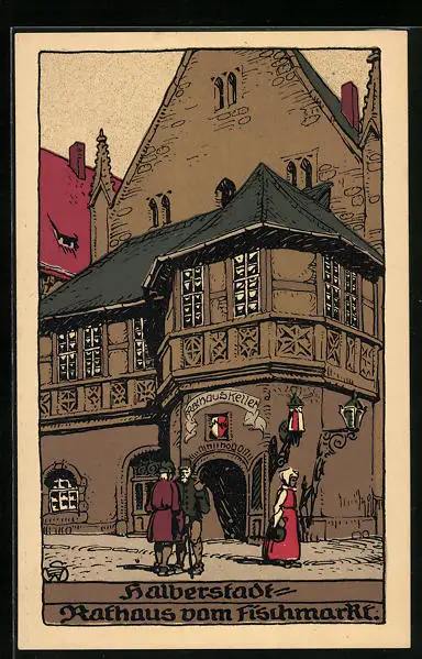 Steindruck-AK Halberstadt, Rathaus vom Fischmarkt, Gasthaus Rathauskeller