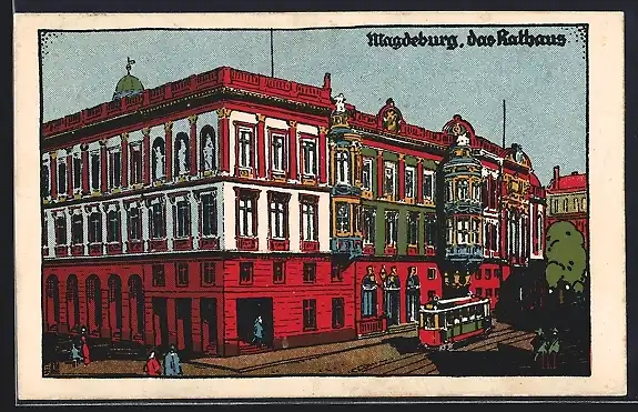 Steindruck-AK Magdeburg, Das Rathaus mit Strassenbahn