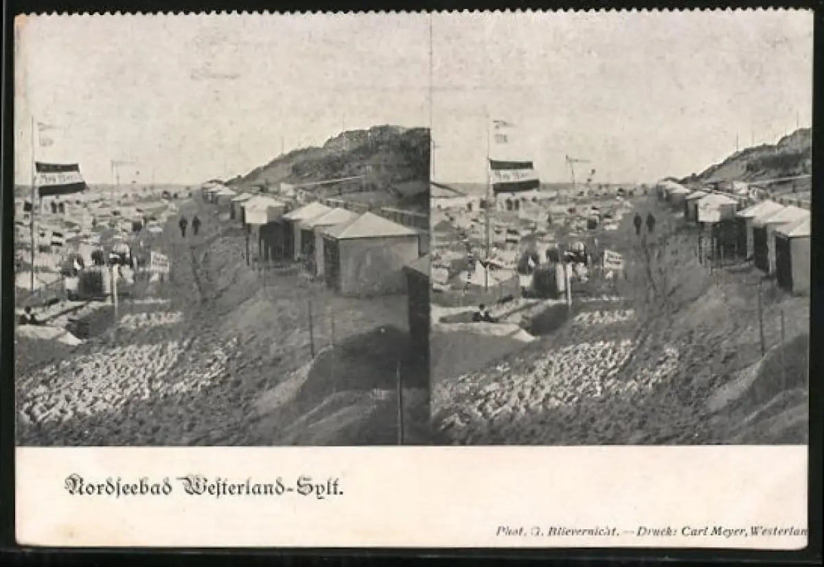 Stereo-AK Westerland /Sylt, Strand mit Badehütten und Dünen