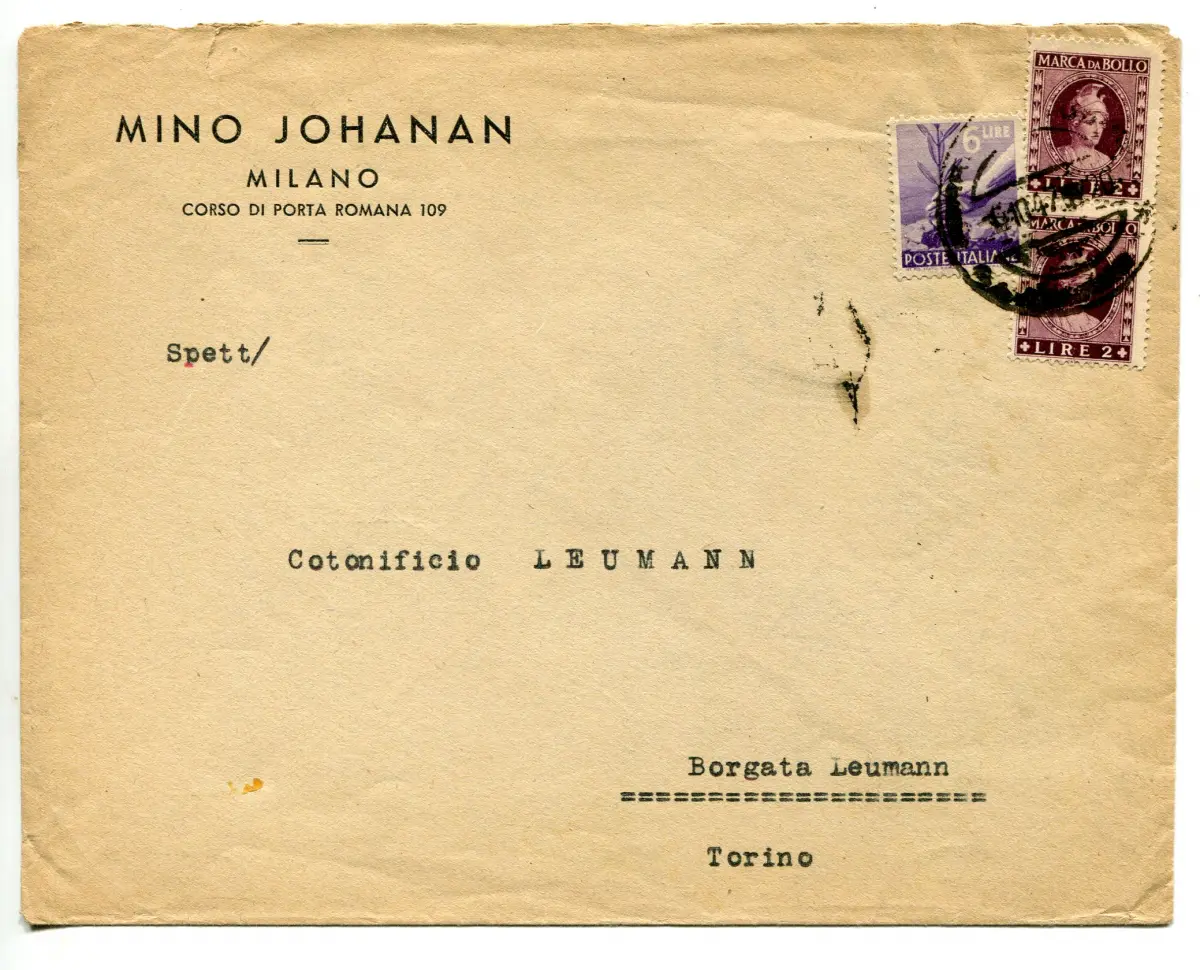 - Steuern per Post - Stempelmarke von Lire 2 Minerva zwei Exemplare + ergänzende Lire 6 Democratica auf Umschlag von Mailand nach Turin am 9.10.47 - im Tarif - mittelmäßige Qualität Nr. 857/A