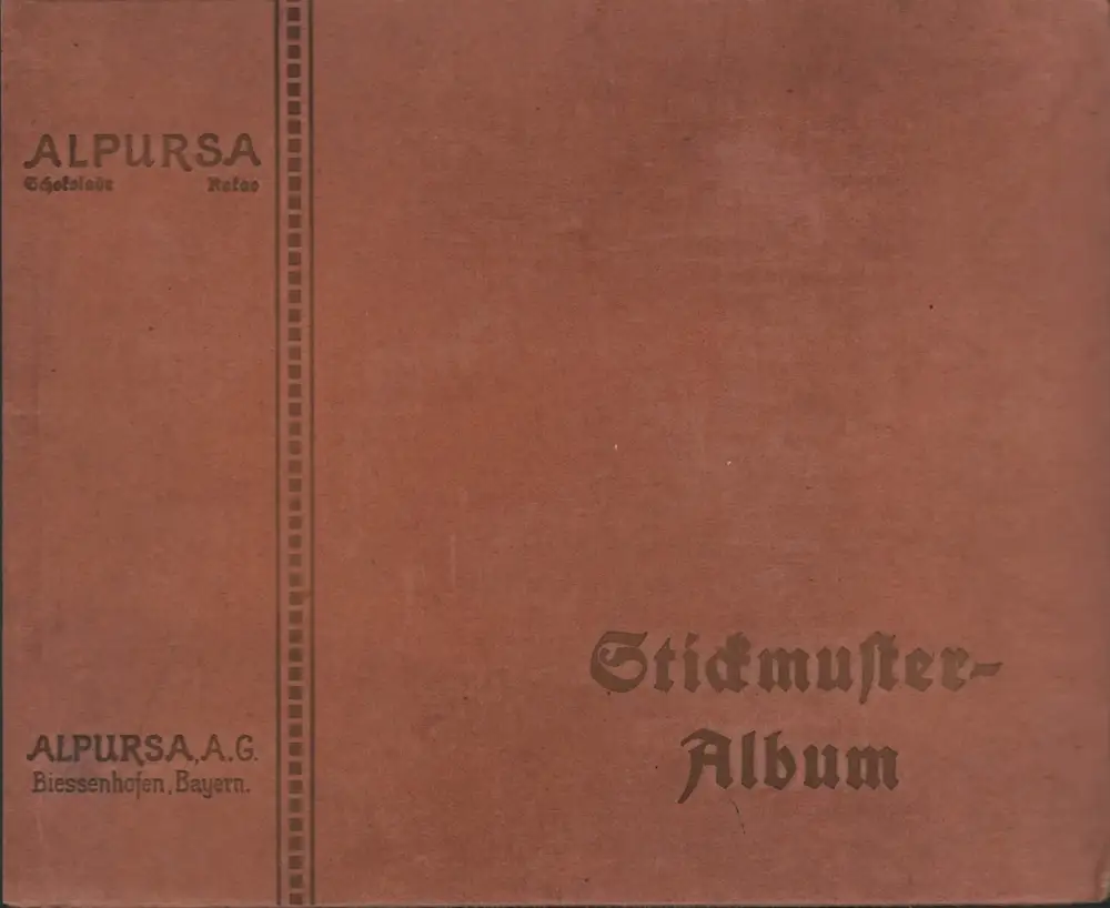 Das seltene u. gut erhaltene Stickmuster-Album von der im Allgäu ansässigen Alpursa Schokolade Kakao AG enthält die Serien Nr. 1-7, 12-18, 22, 24, 27, 29, 33, 35, 36-49, 51-80, darunter folgende Motive: Musikinstrumente, Spielsachen, Wappen deutscher Staaten, Musizierende Englein, Antike Muster, Alte Embleme, Bajazzo, Feldblumen, Vögel, Knabenspiel. Phantasieborten, Blumenkanten, Rotkäppchen, Großes ABC, Münchner Kindl, Osterhase, Weihnachtsgruß, Mohnblumen u.v.m. - Album mit geringen Gebrauchssp., die Bilder sauber eingeklebt