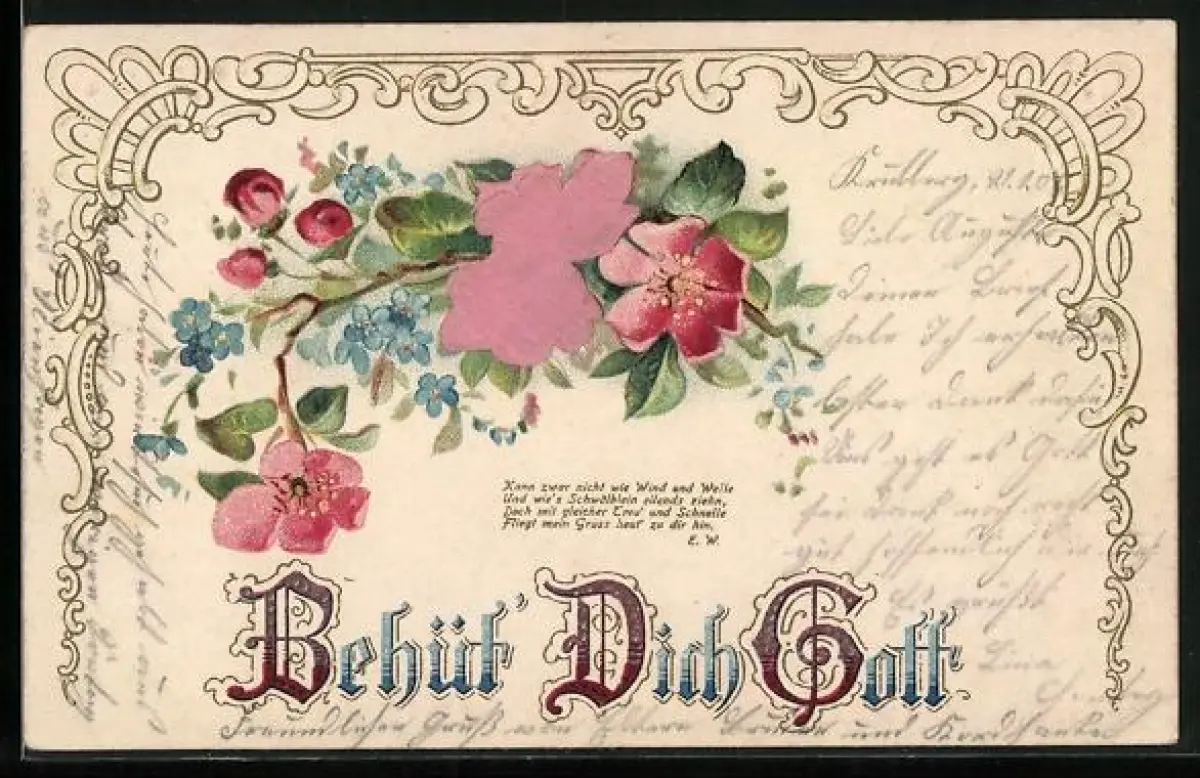 Stoff-Präge-AK Blühender Zweig mit Ornament, Behüt` Dich Gott
