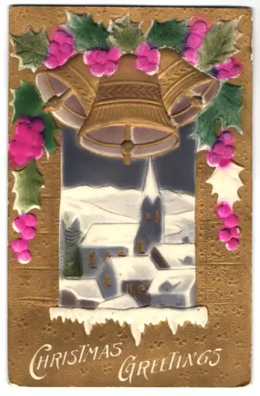 Stoff-Präge-AK Ortsansicht im Winter, Passepartout mit Glocken, Stechpalmelemente aus Stoff, Airbrush
