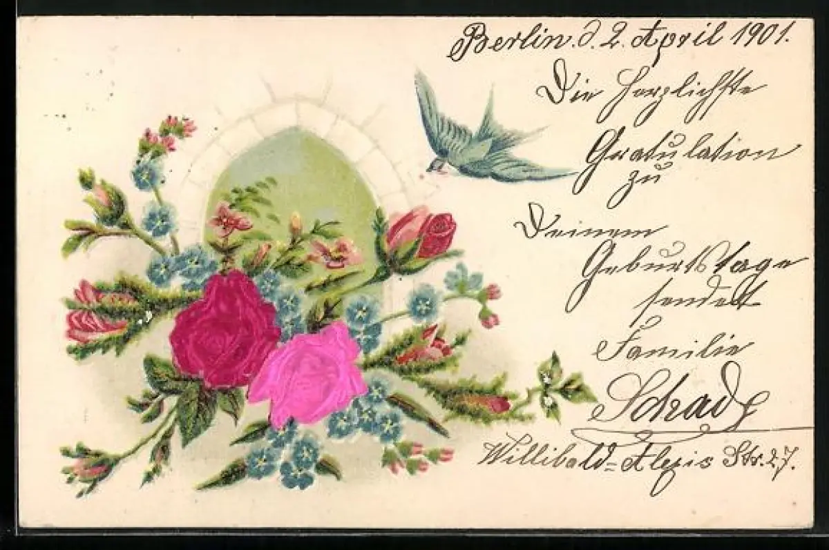 Stoff-Präge-AK Schwalbe mit Brief im Schnabel und Rosen in voller Blute