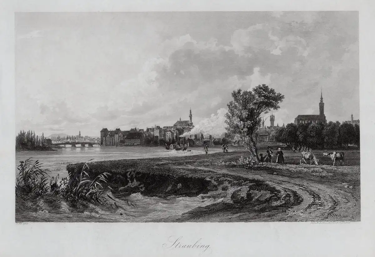Straubing. Ansicht über die Donau Großer,originaler Stahlstich um 1850