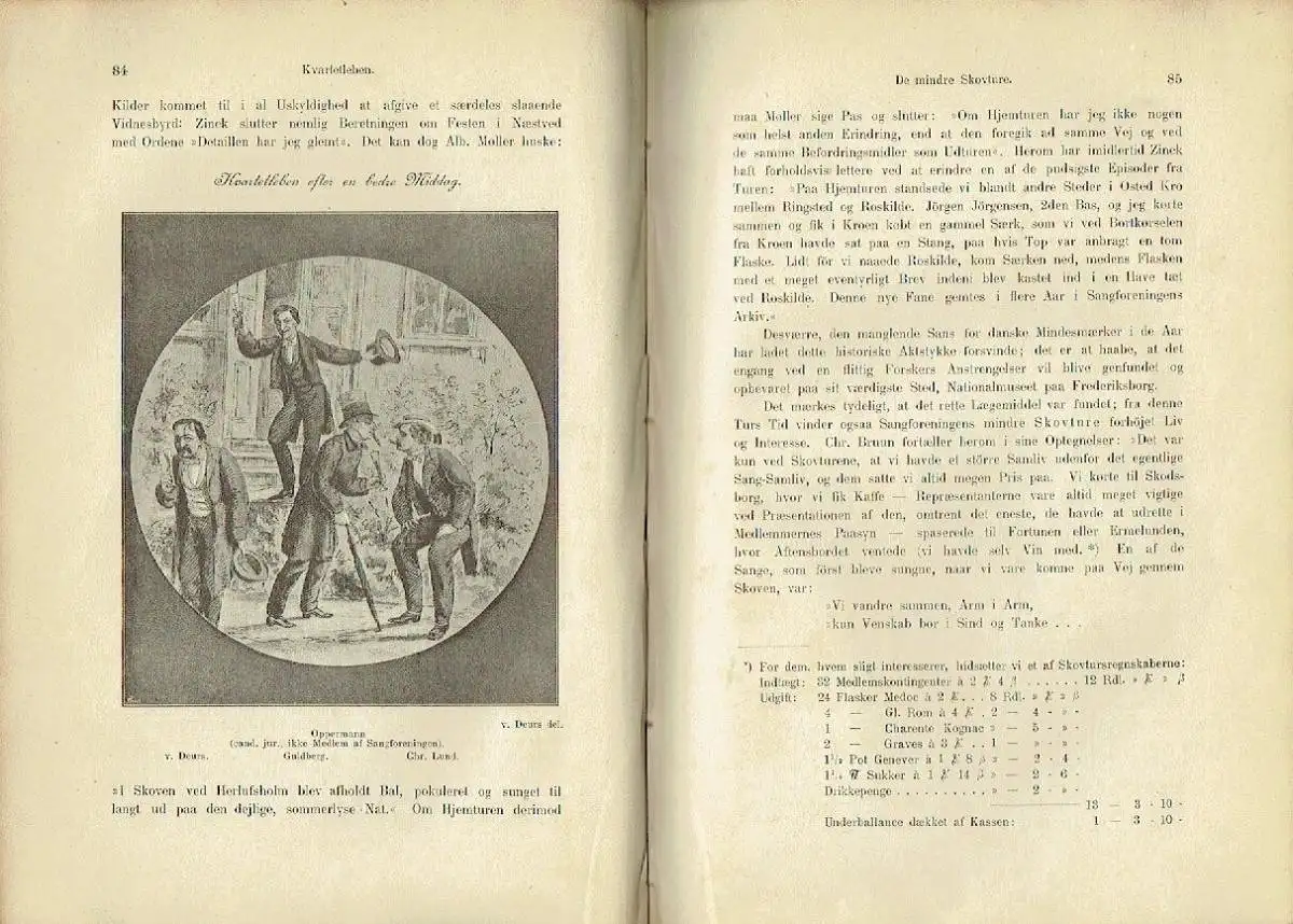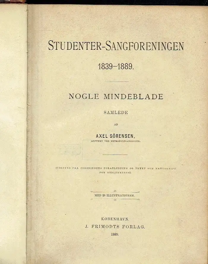 Udgivne paa oreningens foranledning og trykt som manuskript for medlemmerne. - Studentersang för 1839 - Sangforeningens Stiftelse - Förste offentlige Fremtræden - 1843-1846. Rig Høst. Tre store Folkefester - 1847. Börnesygdomme. En Krise - 1848-49-50. Krigsaarene. Lang Rekonvalescensperiode - 1851 -1854. Christianiatog. Oktetten. Ringstedtur - 1854-1858. Heises Tid. C. J. Hansen. Lundenserne - 1858-1864. Adolf Knudsens, Chr. Richardts og Ottesens Tid - 1865-1871. Chr. Lunds og Axel Liebmanns Tid - 1871-1884. Otto Mallings Tid - 1884-1889. Levysohns Tid. Slutning - Bilag. Lidt Statistik (1. Medlemsantal. 2. Bestyrelse. 3. Koncerter. 4. Repertoire. 5. Visedigtere. 6. Ture)