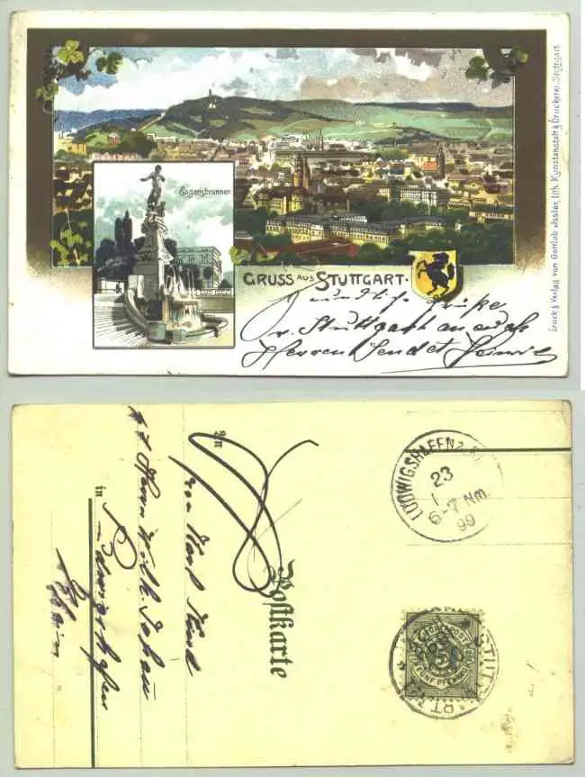 Stuttgart 1899 (intern : 1020117) Artikelbeschreibung u. Zustand : Siehe Scan. Weitere Infos : Alte Ansichtskarte "Gruss aus Stuttgart". PLZ-Bereich pauschal 70173. Beschrieben u. postalisch gelaufen mit Briefmarke u. Stempel von 1899