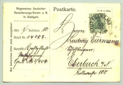 Stuttgart 1915 (intern : 1020138) Artikelbeschreibung u. Zustand : Siehe Scan. Weitere Infos : Alte Firmenpostkarte der Firma Allgem. Deutscher Versicherungs-Verein, Stuttgart. PLZ-Bereich pauschal 70173. Beschrieben und postalisch gelaufen mit Briefmarke und Stempel von 1915. Vielleicht auch fuer den Heimatsammler interessant ?