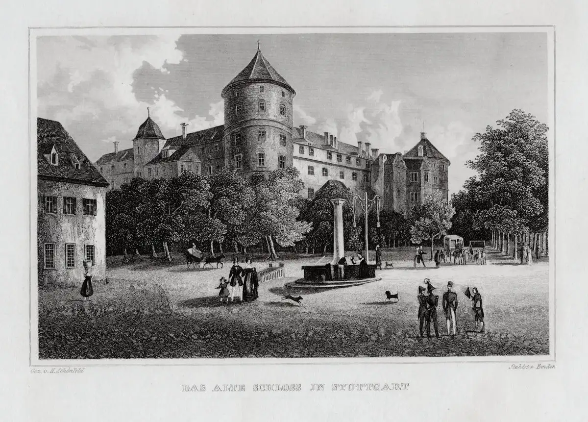 Stuttgart. Das alte Schloß. Original Stahlstich Emden um 1840