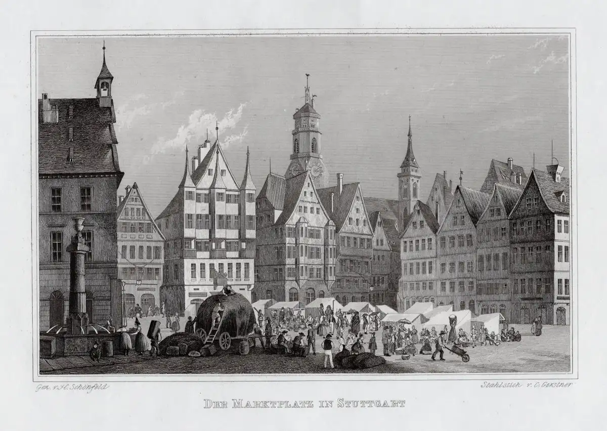 Stuttgart. Der Marktplatz. Original Stahlstich Gerstner um 1840