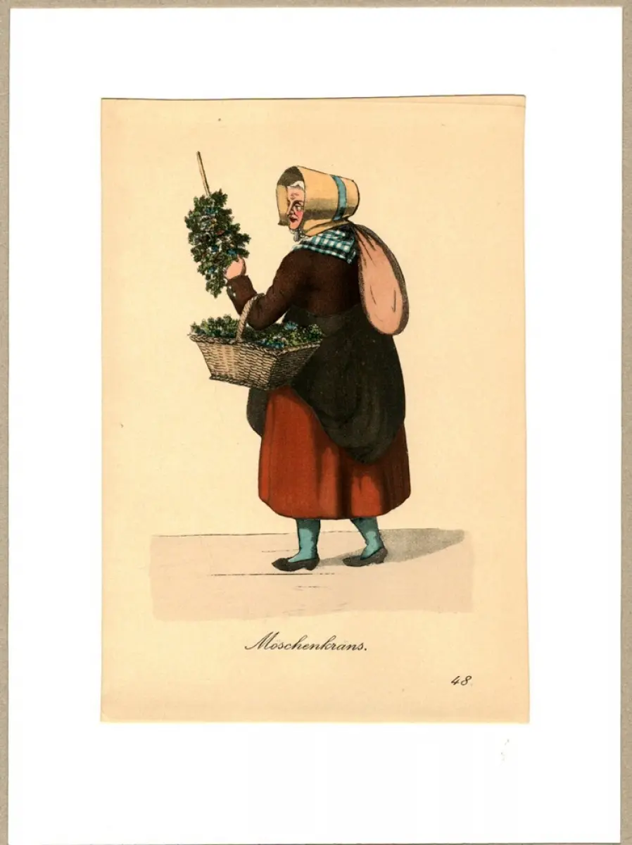 Titel: Möschenkräns! [Waldmeisterkränze zu verkaufen!]. Kräuterverkäuferin | Herbalist. Original-Lithographie, altkoloriert