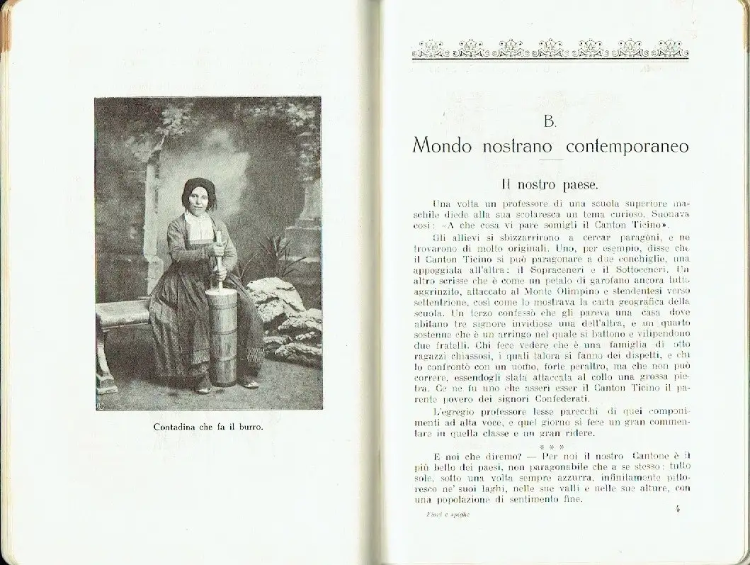 guter Zustand, Gebrauchs- und Alterungsspuren: Umschlag etwas vergilbt und fleckig - Seitenschnitt und Seitenränder der oberen Ecken teils mehr oder weniger braunfleckig - Seiten sonst sauber und ordentlich - Rückseite senkrecht angeknickt, Il presente Volumetto di lettura amena che la Reverendissima Suor Esterina ha inteso dedicare agli allievi d'ambo i sessi delle Scuole elementari e maggiori e dei primi corsi ginnasiali, contiene racconti, novelle, descrizioni, dialoghi, bozzetti ecc. in massima parte di sapore veramente ticinese e traboccanti di amor patrio. Ogni brano poi è inspirato ai più puri principi di una sana morale religiosa. Questi pregi intrinseci del libro basterebbero da soli a raccomandarlo alla benevola accoglienza del piccolo mondo intellettuale cui è destinato se, modestia a parte, nella nostra qualità di editori, non fossimo pur noi tentati di far valere quel po' di lavoro disinteressato che con intelletto d'amore abbiamo prodigato alla pubblicazione di « Fiori e Spighe » per renderla il più possibile accetta anche dal lato estetico sia per i caratteri che per la nitidezza delle illustrazioni e la disposizione della materia in genere. - Mondo nostrano - Mondo nostrano antico: - Un ex voto - Tra i bagliori - Che vita! Che vita! - Di venti in venti anni - Mondo nostrano contemporaneo: - Il nostro paese - Il sogno dell'emigrato - Ricordi e riflessi - Orsù; rinnoviamoci - Mondo elvetico - Dalla città di J. J. Rousseau - Dalla città degli Zaehringen - Dalle sponde della Limmat - Salutando il Bernina - Mamma Elvezia e i ventidue Cantoni - Mondo biblico - La sorella di Mosè - Scena biblica - La moglie di Pilato - Mondo estetico. - La Madonna della Seggiola - San Marco di Venezia - Mondo domestico. - La casa d' Isomaco - Poesia nella prosa - Note d' igiene - Ci stia a cuore! - Tavola certosina ? ... E perchè no ? - Doni della madre terra - Mondo morale - Fili d'oro - Dell'arrossire - Tutto con moderazione - Ogni bene dall'Alto - Vera bellezza: bellezza perenne - La speranza, Halbleinen, ca. 13,5 x 20,5, 166 Seiten mit zahlreichen Bildern