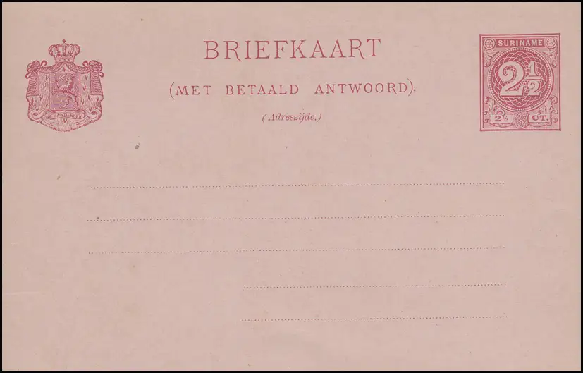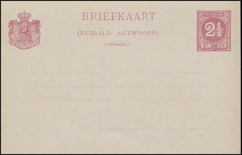 Suriname Postkarte mit Antwort Ziffer 2 1/2 C. / 2 1/2 C. um 1890 ungebraucht **