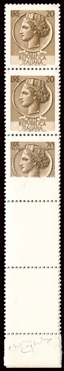 Syracusana Lire 20 Vinylkautschuk Sortenstreifen Vollgummi - MHN - - - Syracusana Lire 20 Nr. 1072 (Vinylkautschuk) vertikaler Streifen von fünf, davon zwei Exemplare mit völlig fehlendem Druck und eines mit unvollständigem Druck - Nicht katalogisiert Cod. 675/14