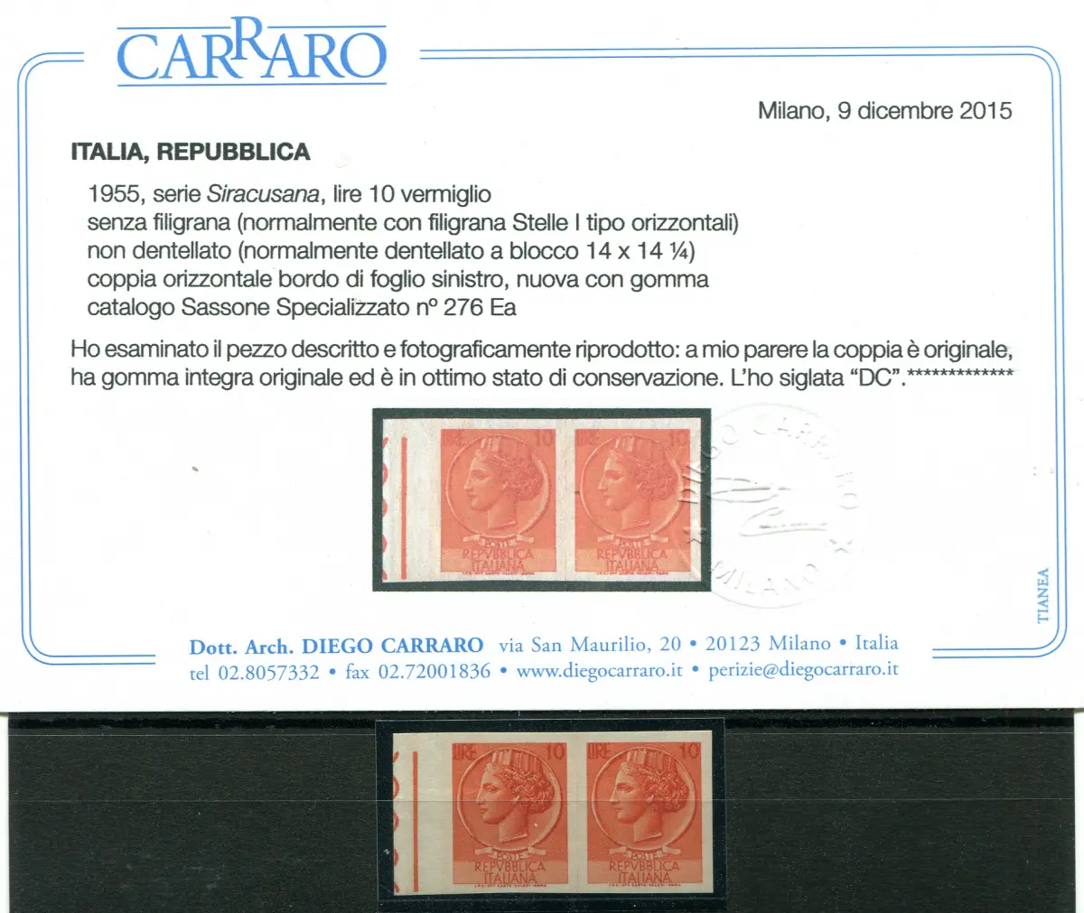 Vollgummi - Syrakus Lire 10 Nr. 764 horizontales Paar ohne Wasserzeichen, ungezähnt b. von f. - Ungewöhnlich - Cert. Carraro - Kat. Manelli Euro 1.400 Nr. 531/L