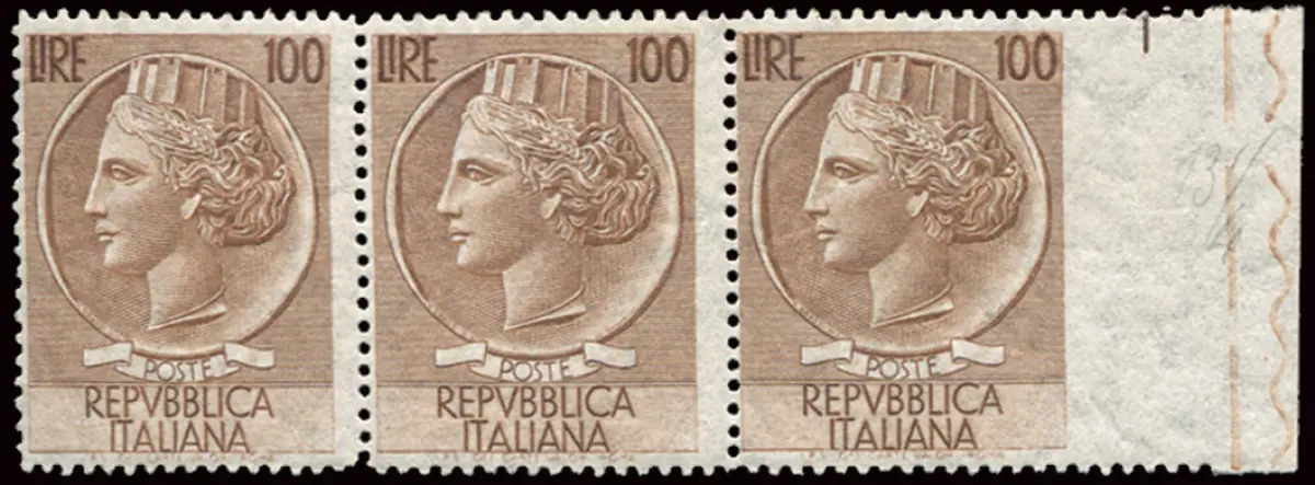 Syrakus Lire 100 Sorten ungezähnt rechts Vollgummi - MHN - - Syrakus Lire 100 Nr. 785/Ifa Dreierstreifen mit dem letzten ungezahnten Exemplar rechts b. von f. - Schön und ungewöhnlich - Kat. euro 600 Cod. 652/14
