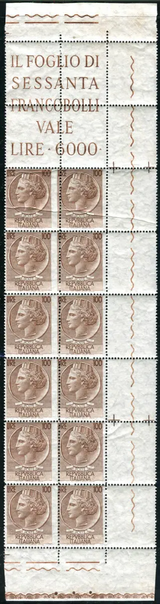 Syrakus Lire 100 Sterne II Sorte dent. Verschiebt Vollgummi MNH - Syrakus Lire 100 Sterne II Verzahnung 13,1/4 Nr. 785/Der Zwölf-Blattwinkelblock mit vertikaler Verzahnung in der Mitte in der Mitte verschoben (eine breite und eine schmale Briefmarke) - Natürliche Papierfalzung auf zwei Exemplaren - Auffällig, nicht katalogisiert Cod. 642/13