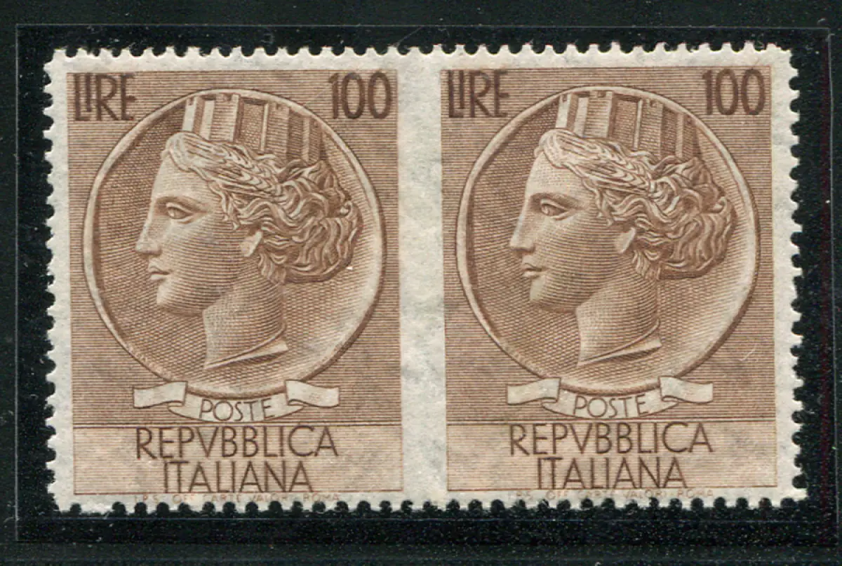 Syrakus Lire 100 Sterne II ungezahnte Sorte in der Mitte Vollgummi - Syrakus Lire 100 Sterne II (65. Rechts) Verzahnung 13,1/4 Nr. 785/Ig Horizontalpaar ungezahnt in der Mitte - Selten - Kat. 1.400 Cod. 654/13