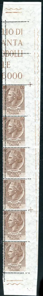 Syrakus Lire 100 Sterne III Sorte Zahnung Vollgummi - Syrakus Lire 100 Nr. 785/II Sterne III senkrechter Streifen mit sechs Marken a. von f. rechts ungezähnt mit Doppelverzahnung links - sehr selten - (siehe Sorte Nr. 785/Ifaa) - Gebraucht für Spezialisten Cod. 653/13