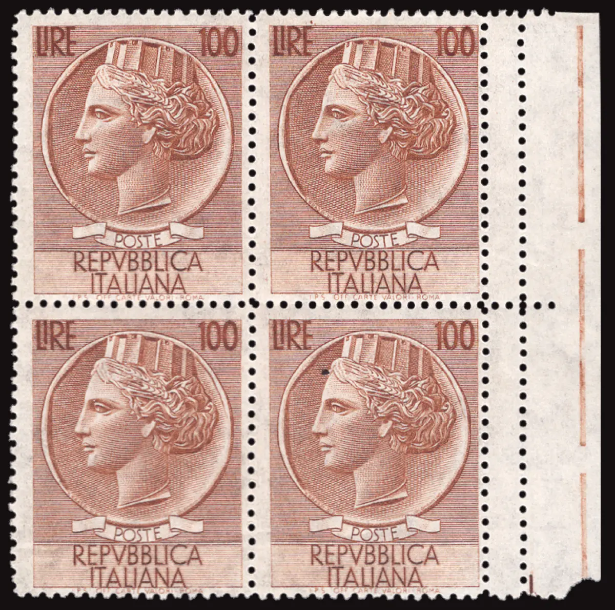 MNH - Vollgummi - Syrakus Lire 100 Sterne Nr. 785/Ih Viertel mit doppelter vertikaler Verzahnung rechts auf den beiden Marken rechts b. von f. - Ungewöhnlich - Kat. euro 450 Cod. 780/17