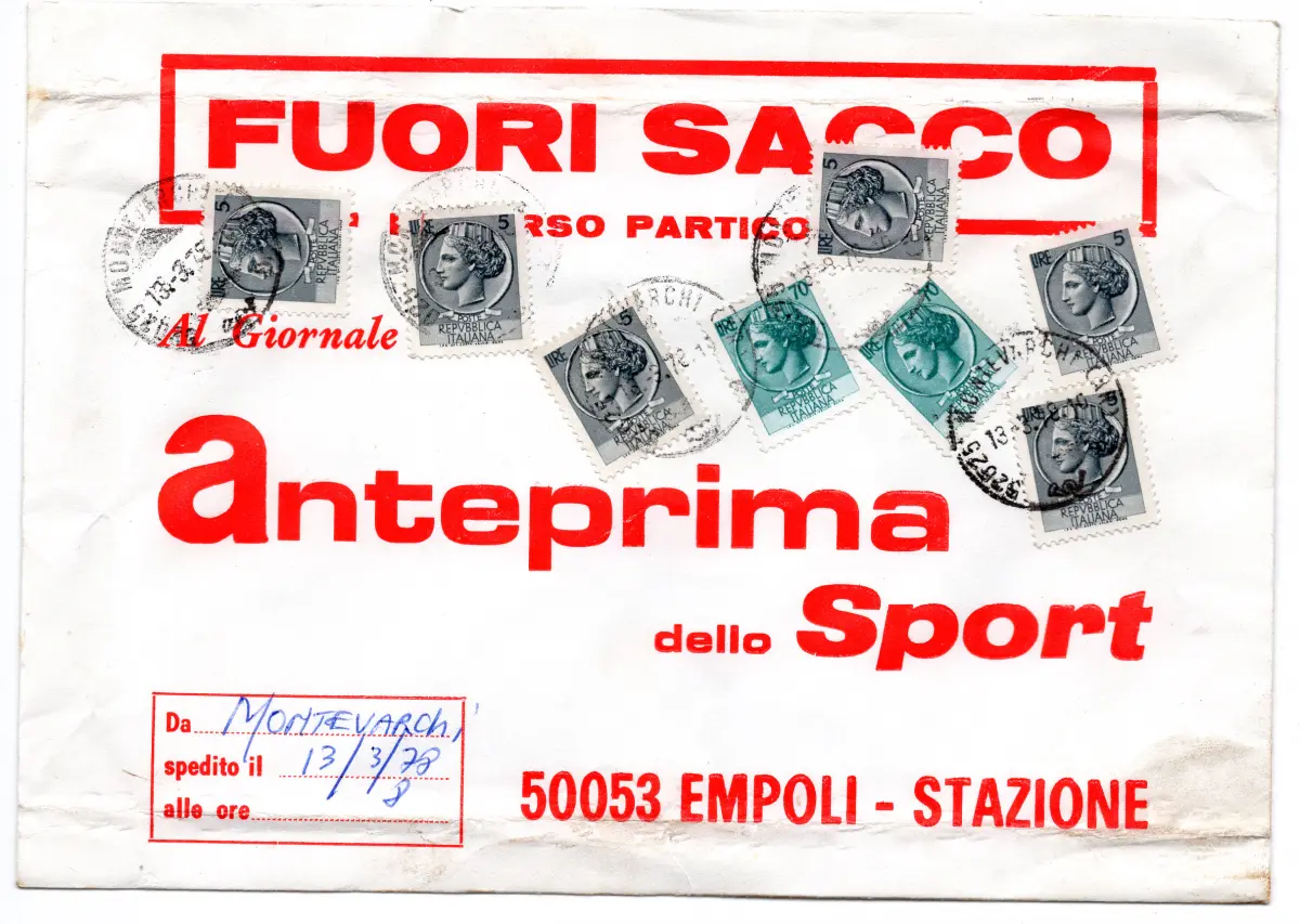 Syrakus Lire 70 X2 + Lire 5 X 6 (einer defekt) auf Umschlag AUS SACK von Montevarchi nach Empoli am 13.3.1978 - Seltener Postdienst Cod. 1260 / Outlet