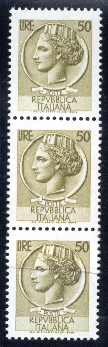 MNH - Vollgummi - Syrakus Lire 50 Nr. 1076i vertikaler Dreierstreifen, das letzte Exemplar auf wieder zusammengesetztem Papier gedruckt - Selten - Kat. euro 700 Cod. 819/17
