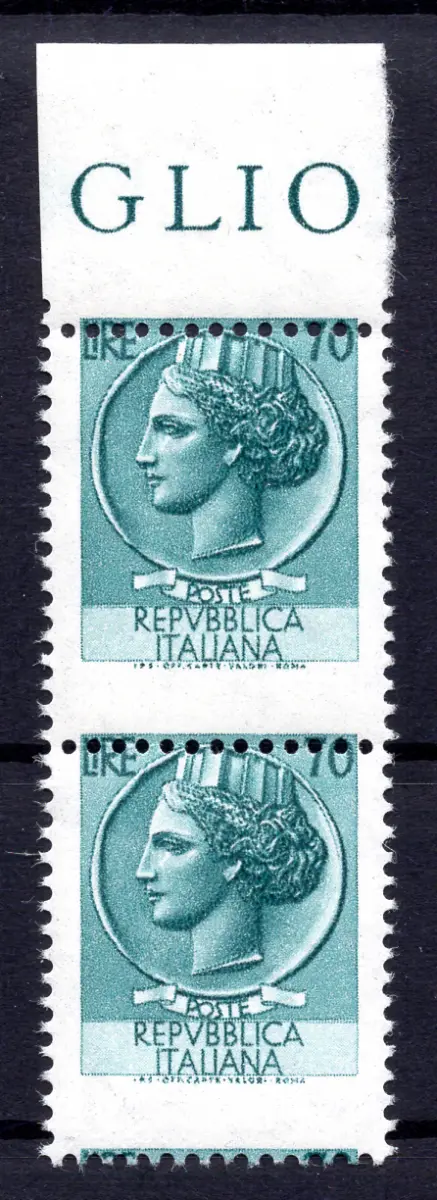 Syracusana Lire 70 vertikales Paar Sorte Vollgummi - Syracusana Lire 70 (Arabica-Gummi) Nr. 1079 vertikales Paar b. von f. mit stark nach unten verschobener horizontaler Verzahnung - Ungewöhnliche Nr. 813/5