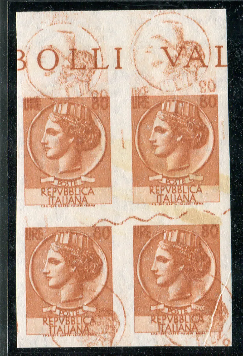 Syracusana Lire 80 (Vinyl) Quartina ungezähnt Vollgummi - Syracusana Lire 80 Nr. 1080 (Vinylkautschuk) Viertel ungezähnt b. von f. doppelter umgedrehter Druck spiegelnd und verschoben (durch Abziehbild) - horizontale Falzung auf zwei Exemplaren oben - Cert. Schlüssel - Schön und ungewöhnlich Cod. 744/13