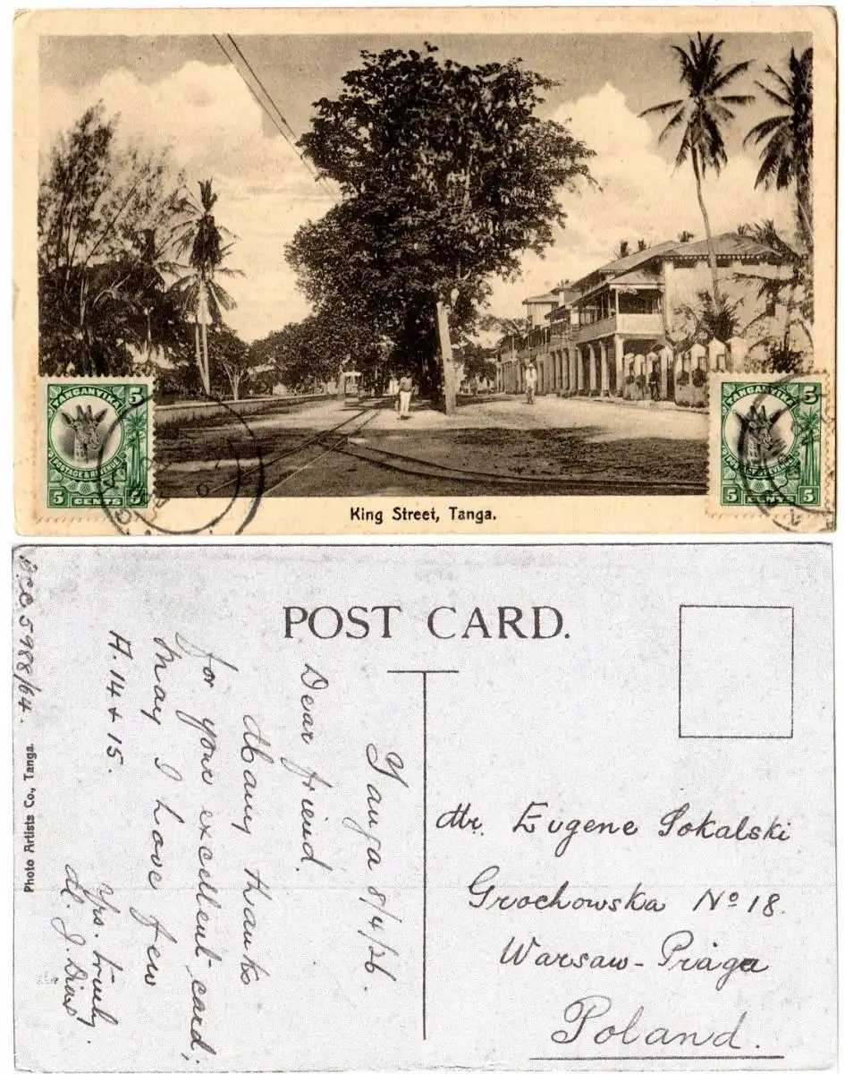 Tansania Tanganyika 1926, 2x 5 C. bildseitig auf Tanga sw-AK n. Polen.