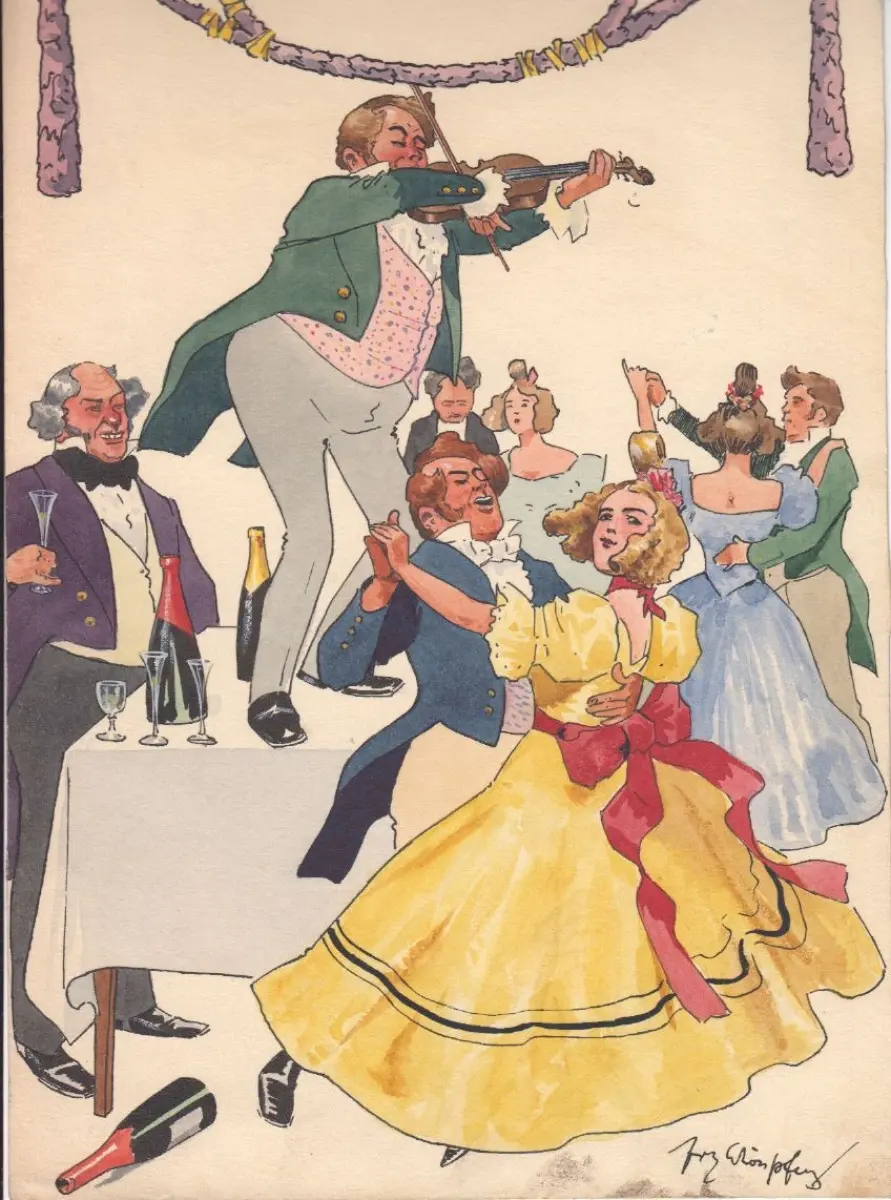 Bemerkungen: Tanzgesellschaft in ausgelassener Stimmung. Der Geiger auf dem Tisch stehend, am Boden liegende Falsche... Fritz Schönpflug (1873-1951), österreichischer Karikaturist, Maler, Grafiker und Ansichtskartenkünstler war Mitbegründer und künstlerischer Leiter der humoristischen Wochenschrift `Muskete`, arbeitete aber auch für andere Zeitschriften, wie die `Wiener fliegenden Blätter`, den `Wiener Figaro`, die `Bombe` und den `Sketch` aus London. Als Ansichtskartenkünstler ist er für seine Darstellungen von Wiener Typen und Karikaturen aus dem Leben in der k.u.k. Armee bekannt. Für den Wiener Postkartenverlag Brüder Kohn Wien (BKW) schuf er rund 1000 Vorlagen. Schönpflug entwarf aber auch Reklameplakate, u. a. Warnhinweise für Fahrgäste der Wiener Straßenbahnen (1910). Schönpflug war von 1906 bis 1936 Mitglied des Wiener Künstlerhauses.
