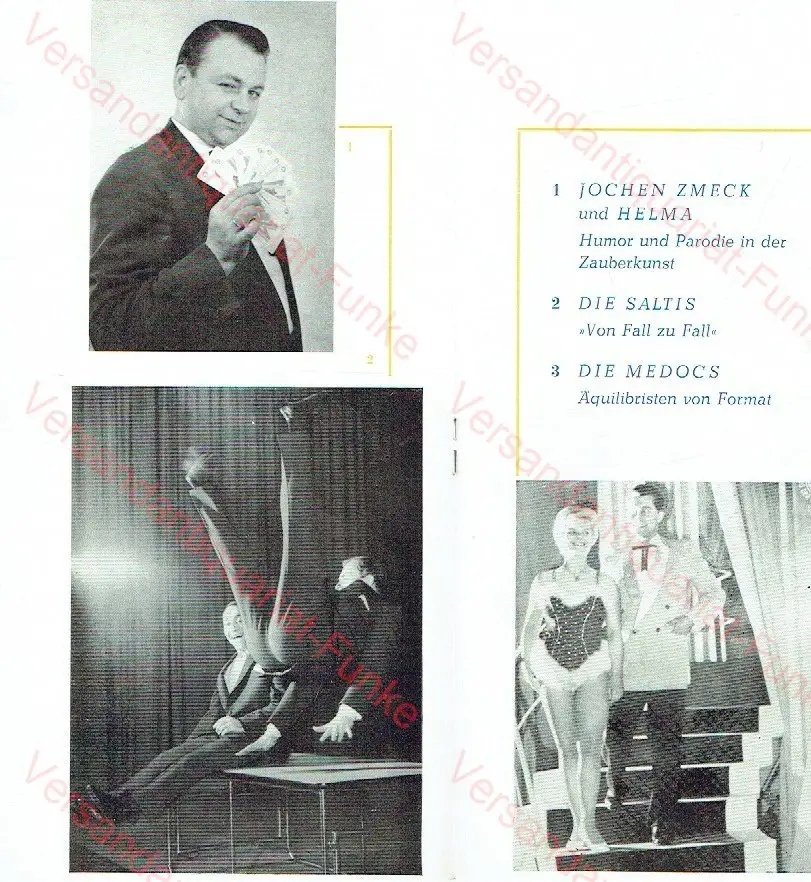 sehr guter Zustand, geringe Gebrauchs- und Alterungsspuren: Vorderseite mit nicht lesbarem Autogramm - Rückseite unten mit kleinem Eselsohr, Programm mit Irene Lecarte aus Frankreich, Carl-Heinz-Fritzsche-Ensemble, Jochen Zmeck und Günter Krause "Emil Ernst Günther „Günthi“ Krause (* 9. Februar 1923 in Erfurt; † 19. Januar 2012 in Halle (Saale)) war ein deutscher Conférencier und Entertainer. Kurz nach dem Abitur wurde Krause zur Wehrmacht einberufen und geriet in Afrika in französische Kriegsgefangenschaft. Nach der Heimkehr entschied er sich für ein Schauspielstudium in Weimar. Danach folgten Engagements an den Theatern in Bernburg und Staßfurt. Ab 1953 war Krause als festes Ensemblemitglied am Thalia-Theater in Halle (Saale) engagiert. In dieser Zeit begann er, zunächst als Nebenerwerb zur Aufbesserung seiner Gage, mit Ansagen im halleschen Steintor-Varieté. Daraus entstanden im Laufe der Zeit eigene Programme, mit denen er nicht nur auf seiner Hausbühne, dem Steintor-Varieté, sondern auch im Ost-Berliner Friedrichstadtpalast gastierte. Im Jahr 1969 begann Günthi Krause daneben seine Tätigkeit als Regisseur und Ansager beim Zirkus Sarrasani. Ab 1973 widmete sich Krause ausschließlich seiner Arbeit als Conférencier und Entertainer, wobei er seine Texte selbst schrieb. In dieser Zeit wurde ihm durch verschiedene DDR-Kulturfunktionäre, die seine Texte kritisierten und zensierten, insgesamt viermal ein Auftrittsverbot ausgesprochen. Neben seinen Tourneen über die Bühnen der DDR war Krause auch in verschiedenen Rundfunk- und Fernsehshows zu erleben. Der Friedrichstadtpalast zeichnete ihn mit der „Goldenen Palastnadel“ aus." (Wikipedia), Papier, ca. 11,5 x 22,5, 8 Seiten mit 5 Bildern