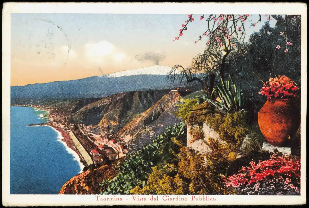 Taormina Vista dal Giardino Pubblico. Vulkan Etna 1939 Sicilia Sizilien