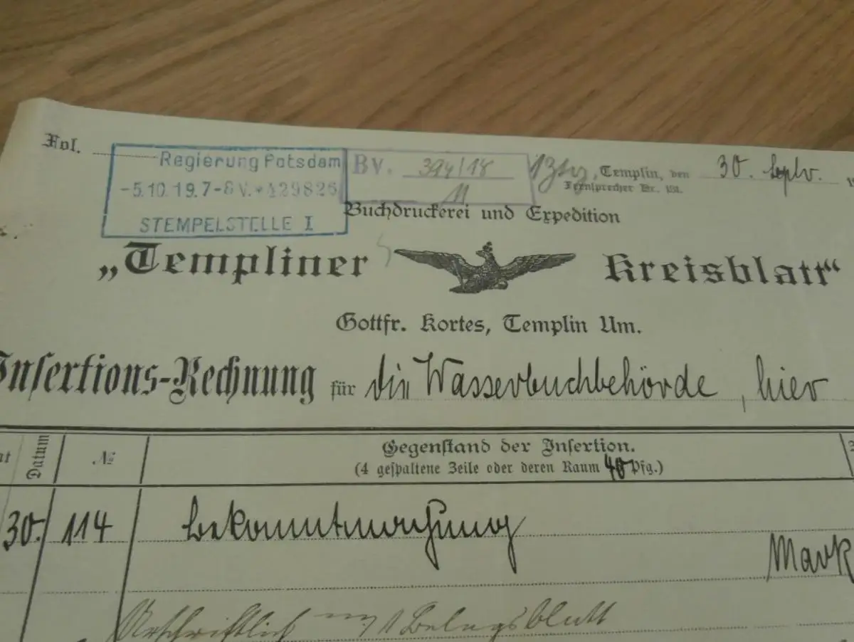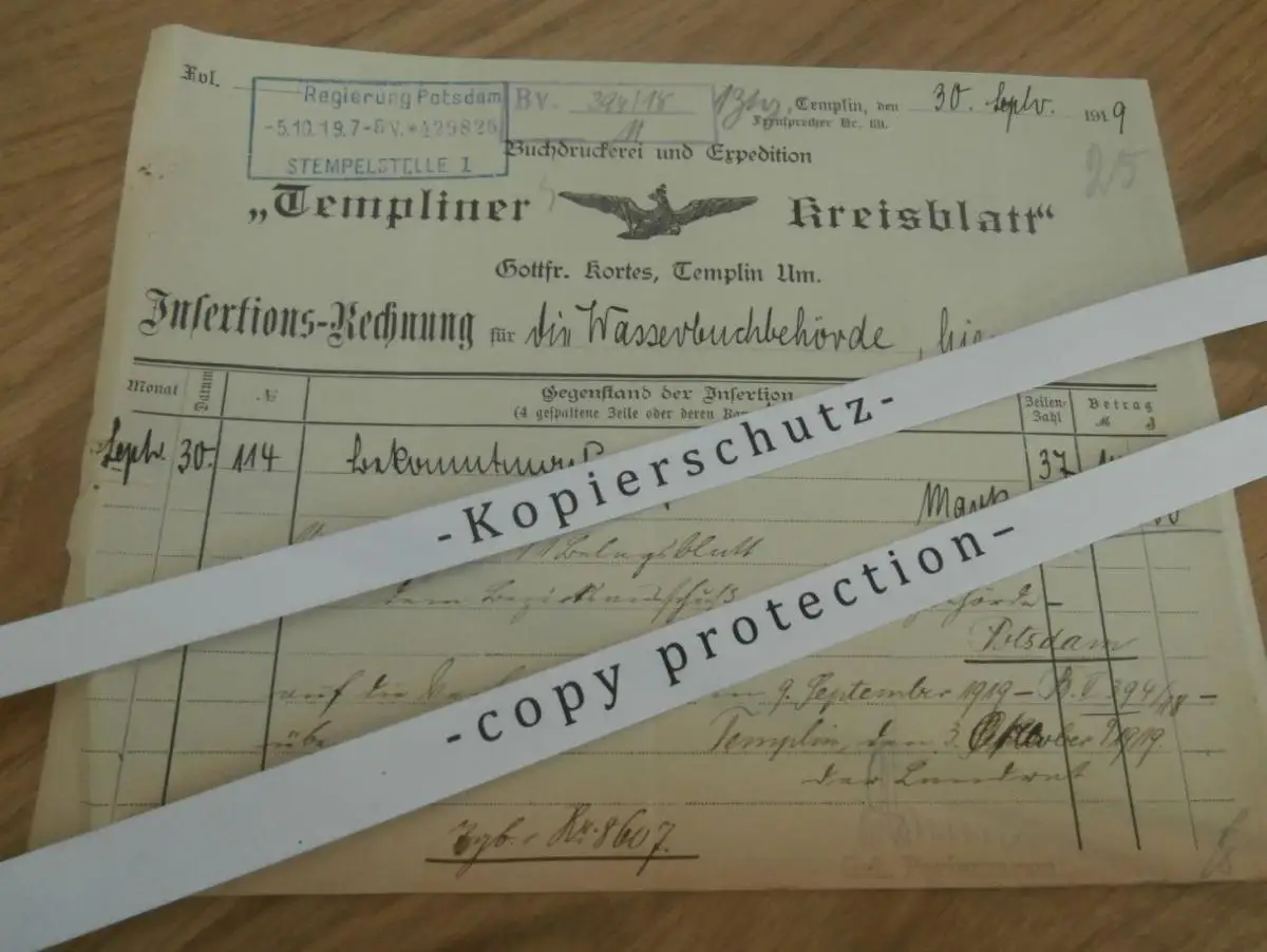 Templiner Kreisblatt , 1919 , altes Dokument , Regierung , Templin , Expedition , Uckermark !!!