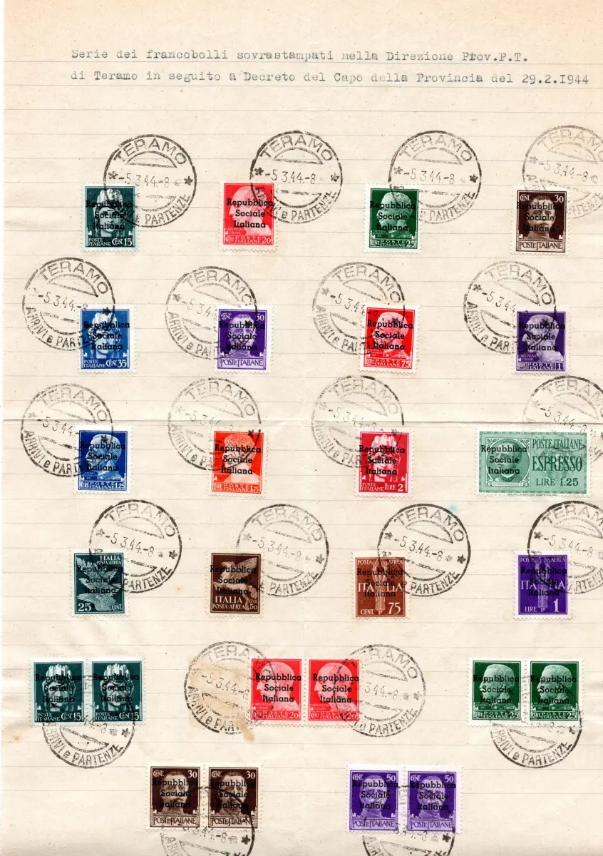 FRAGMENT - Teramo - Briefmarken Italiens aufgedruckt Nr. 1/16 die komplette Serie auf Blatt Papier gestempelt mit Originalstempel Teramo 5.3.44 + die ersten fünf Werte der Serie in waagerechten Paaren (nicht gezählt) - ein Exemplar (Nr. 13) defekt, nicht gezählt - Kat. euro 1.330 Cod.390/182