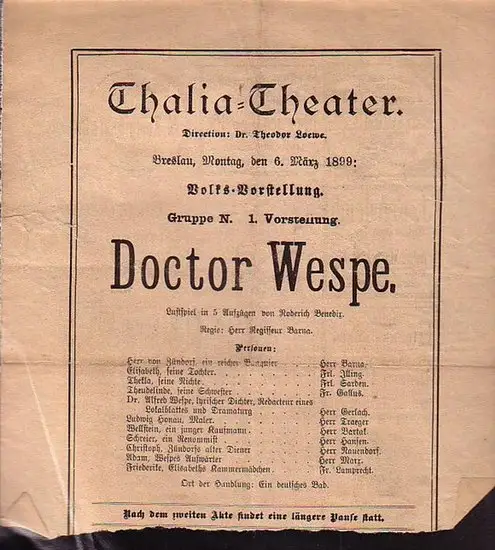 Thalia - Theater (Breslau). - Direction: Theodor Loewe. - Benedix, Roderich: Programmzettel zu: Doctor Wespe. Lustspiel in 5 Aufzügen. Regie: Herr Barna. Aufführung: 6. März 1899. (Aus der Breslauer Theater - Zeitung). Mit: Barna, Illing, Sarden, Gallus