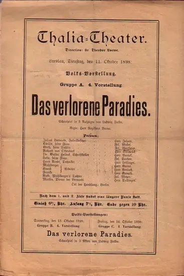 Thalia - Theater (Breslau). - Direction: Theodor Loewe. - Fulda, Ludwig: Programmzettel zu: Das verlorene Paradies. Schauspiel in 3 Aufzügen. Regie: Herr Barna. Aufführung: Thalia - Theater am 11. Oktober 1898. Direction: Theodor Loewe. (Aus der Breslauer