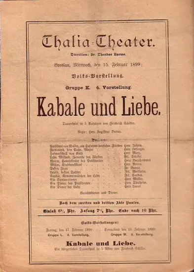 Thalia - Theater (Breslau). - Direction: Theodor Loewe. - Schiller, Friedrich von: Programmzettel zu: Kabale und Liebe. Trauerspiel in 5 Akten. Regie: Herr Barna. Aufführung: 15. Februar 1899. (Aus der Breslauer Theater - Zeitung).