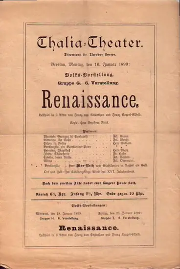 Thalia - Theater (Breslau). - Direction: Theodor Loewe. - Schönthan, Franz von und Koppel - Ellfeld, Franz: Programmzettel zu: Renaissance. Lustspiel in 3 Akten. Regie: Herr Niedt. Aufführung: 16. Januar 1899. (Aus der Breslauer Theater - Zeitung). Mit F